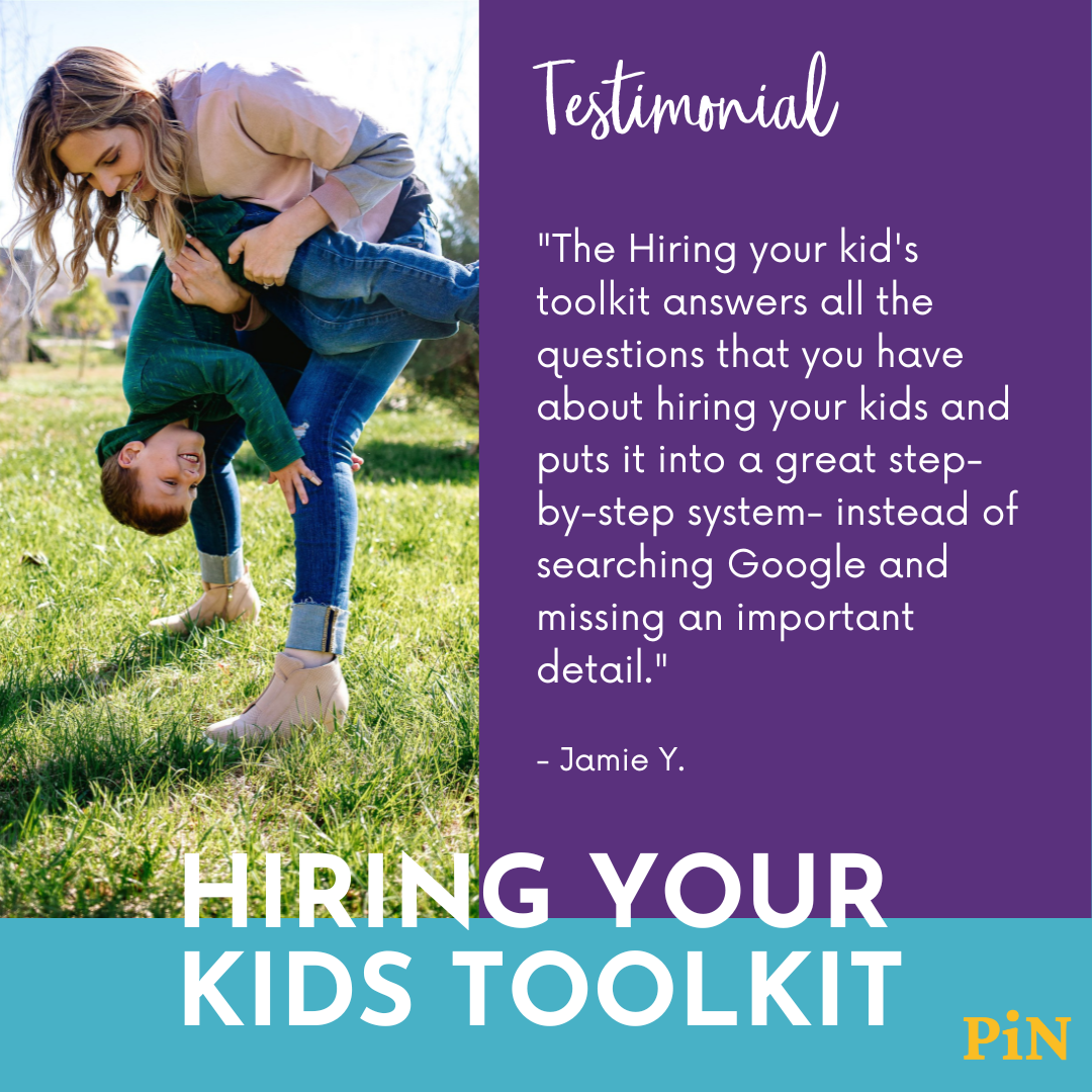 The Hiring your kids toolkit answers all the questions that you have about hiring your kids and puts it into a great step by step system- instead of searching google and missing an important detail.